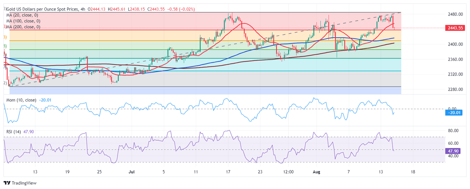 From a technical perspective, the daily chart for XAU/USD suggests the bearish potential remains limited. The pair found an intraday bottom at around the 23.6% Fibonacci retracement of the June/July rally at $2,438.80, now holding above the level. At the same time, technical indicators have lost their upward strength but remain within positive levels. Only the Relative Strength Index (RSI) turned south but stays far from confirming another leg south. Finally, XAU/USD keeps developing above all its moving averages, with the 20 Simple Moving Average (SMA) now flat at around $2,417.50.