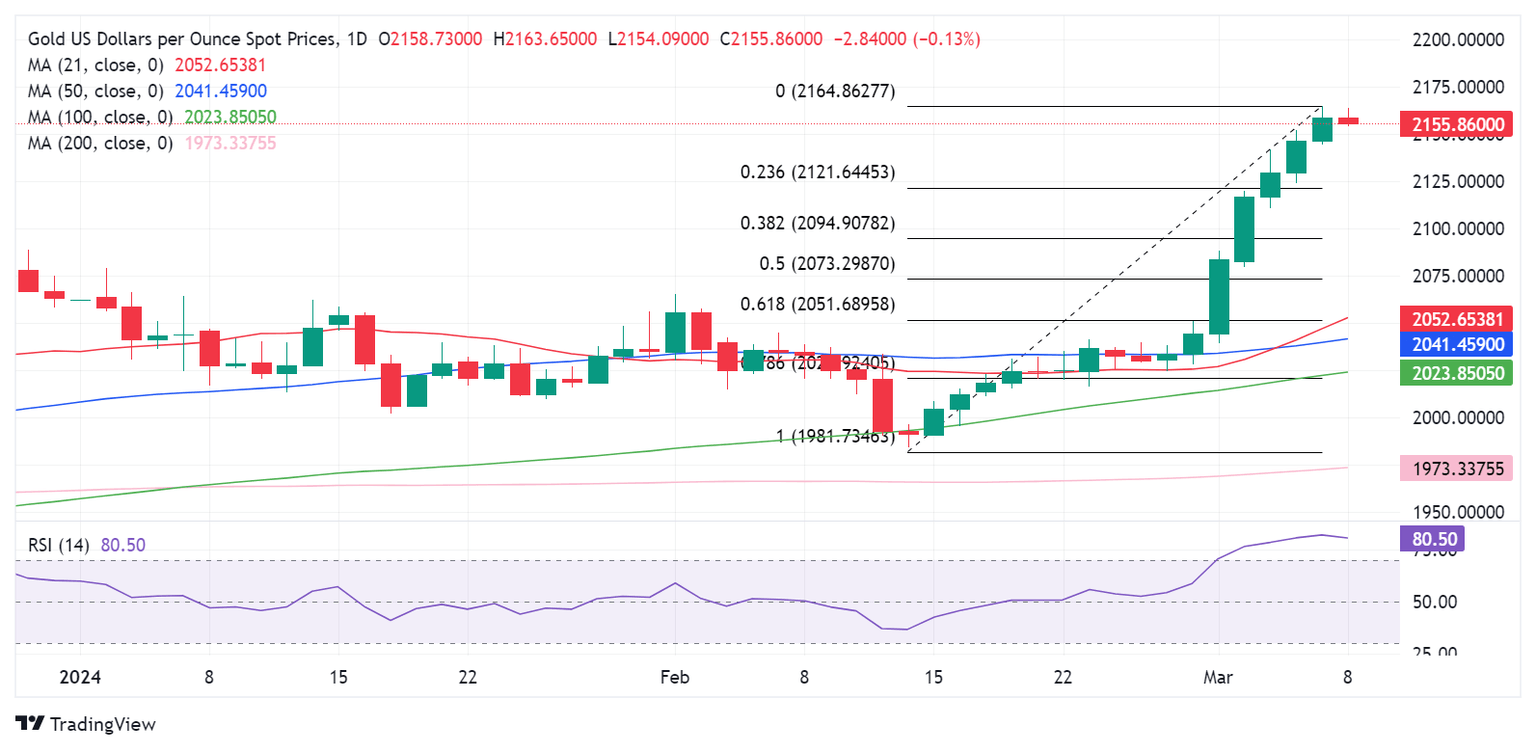 The next cushion is seen at $2,121, the intersection of Wednesday’s low and the 23.6% Fibonacci Retracement (Fibo) level of the recent rally from the February 14 low of $1,984 to the all-time high of $2,165.