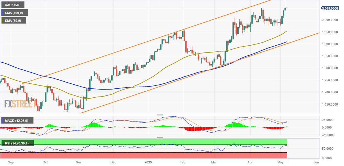 Gold price oscillates in a narrow band around the $2,050 region through the Asian session on Friday and remains well within striking distance of an all-time high touched the previous day. The downside seems cushioned amid concerns about the United States (US) banking sector and the Federal Reserve's (Fed) less hawkish outlook. Following the recent collapse of the First Republic Bank earlier this week, investors now fear that regional lender PacWest Bancorp could be the next potential domino to fall. This adds to worries about a full-blown banking crisis and led to another rout in shares of regional lenders on Thursday, which, in turn, continues to underpin the safe-haven XAU/USD.