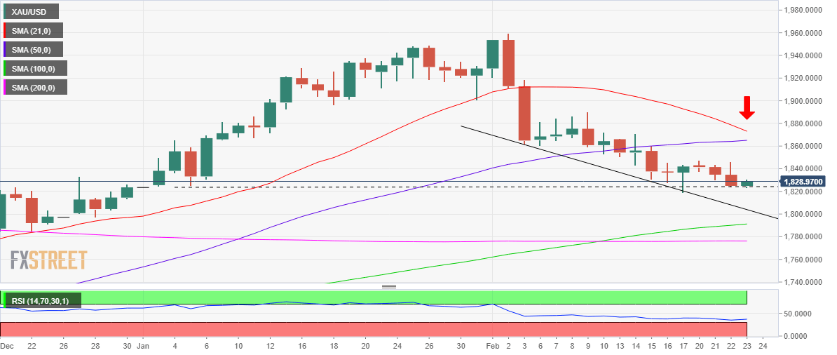 - Gold price yields a downside break below $1,825, the next target seen at $1,804.