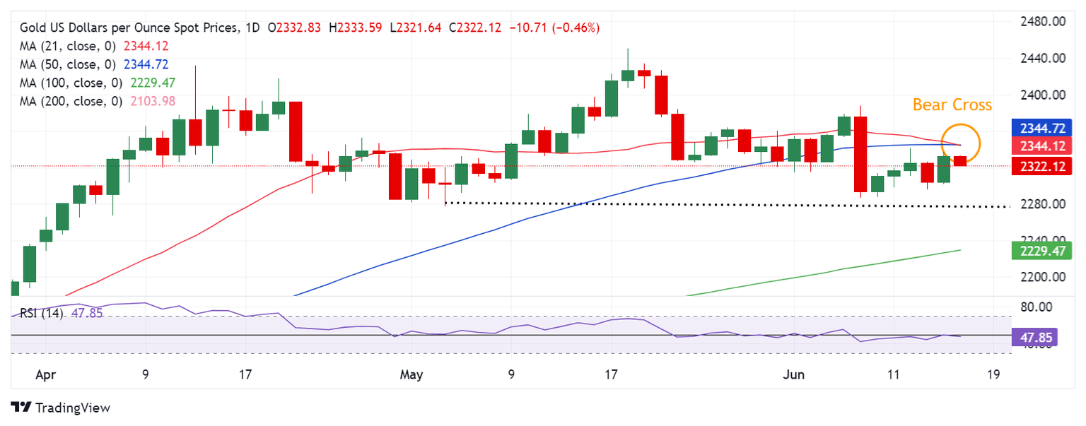 - Gold price once again aims for $2,300 and $2,277, with a Bear Cross and a bearish RSI in play.