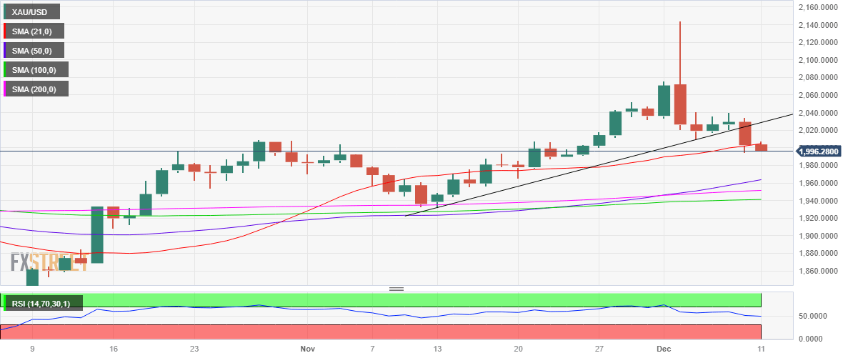 Gold price is testing a 10-day low of $1,995 set on Friday, seemingly vulnerable early Monday, as the Big Central Banks week kicks off. The United States Dollar (USD) is clinging to its recovery gains amid a cautious market environment and steady US Treasury bond yields.