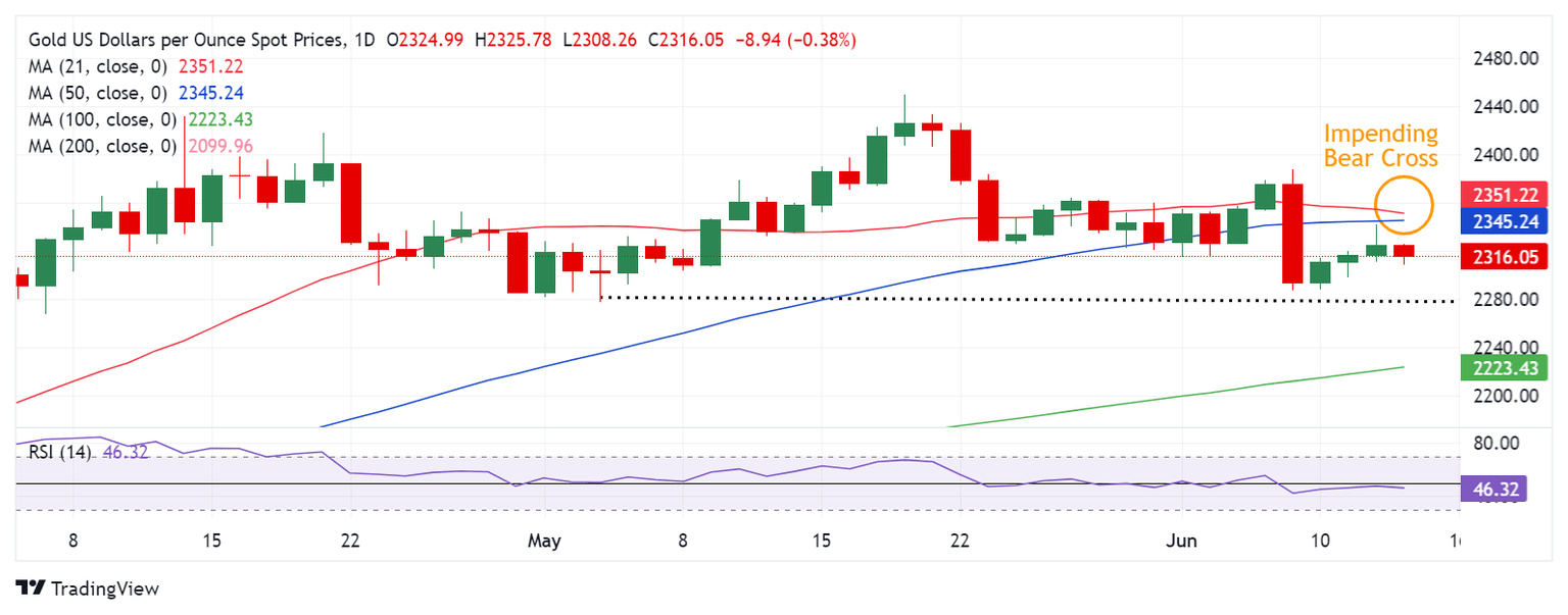 As observed on the daily chart, the Gold price defied bearish pressures on Wednesday but the downside bias remains intact going forward, as the 14-day Relative Strength Index (RSI) holds well below the 50 level and a Bear Cross remains in the making.