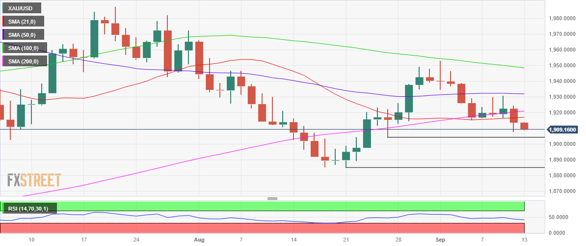 The US Dollar is finding fresh demand as a safe-haven asset due to risk aversion, exerting downward pressure on Gold price. The US Treasury bond yields are reversing the previous drop on expectations that hot US CPI data will prompt the Fed to deliver another interest rate hike in November or December, as the probability of a September Fed pause is 93%. Therefore, Gold price remains exposed to downside risks below $1,900.