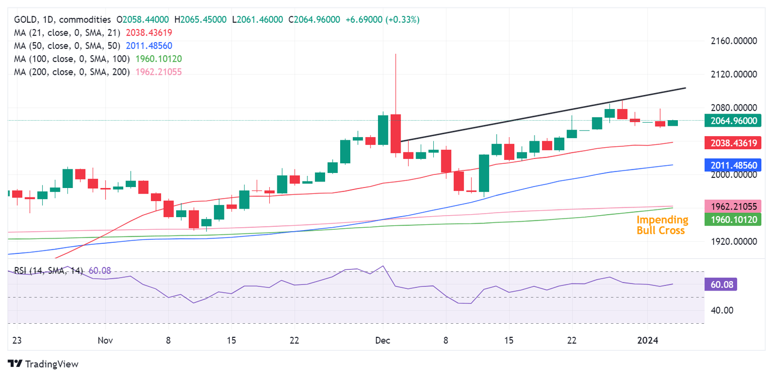 The last line of defense for Gold buyers is aligned at the 21-day Simple Moving Average (SMA) at $2,038.