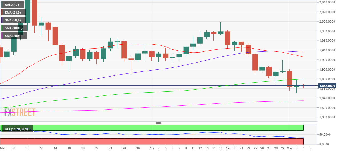 This suggests that gold price could revisit Tuesday’s low of $1,850. On an aggressive Fed policy outlook, hinting at a more than 50 bps hike in June, XAU/USD could accelerate the downside momentum to hit the 200-DMA at $1,835.