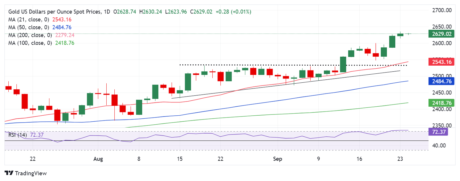 Despite a modest recovery staged by the US Dollar and overbought conditions on the daily chart, Gold price holds its position close to the all-time high, as buyers refuse to give up on the back of the latest dovish Fed commentaries, increased hopes of Chinese stimulus coming through and escalating Middle East geopolitical tensions.