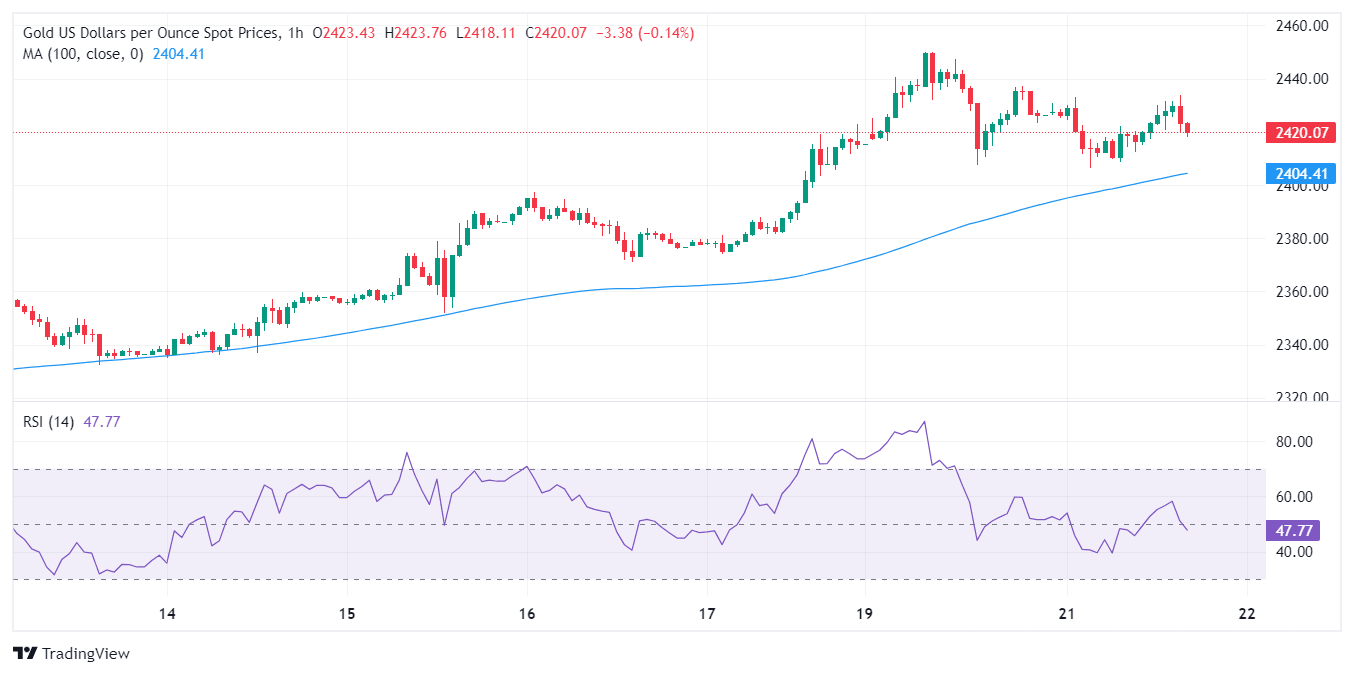 Spot Gold trades marginally lower on Tuesday as the US Dollar benefited just modestly from a sour market mood. XAU/USD hovers around $2,420 after posting an intraday low of $2,406.10. Asian and European indexes edged lower as investors took profit ahead of earnings reports while lacking fresh catalysts. The macroeconomic calendar had nothing relevant to offer on Tuesday, with another batch of speeches from Federal Reserve (Fed) officials failing to impress.
