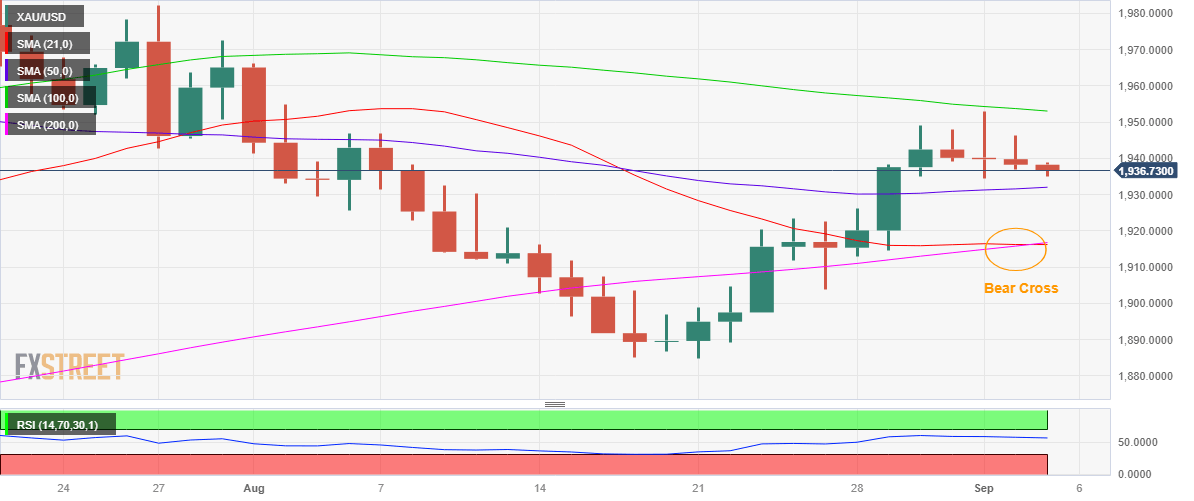 Gold Price Forecast: XAU/USD struggles below $1,950 amid a Bear Cross