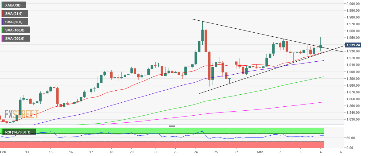 On the downside, the immediate cushion is seen at the triangle resistance turned support at $1,935, below which a sharp sell-off could be triggered towards the powerful cap of $1,928.