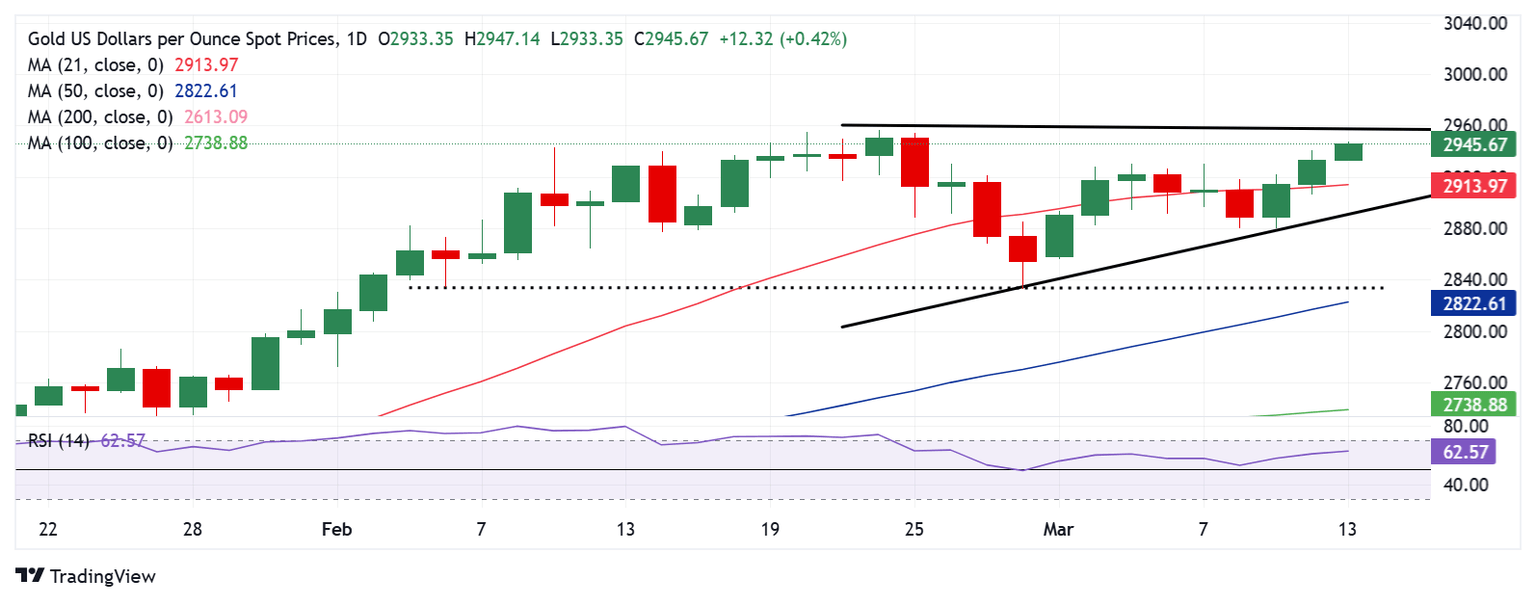 - Gold price looks to retest all-time highs of $2,956 as daily RSI stays bullish.