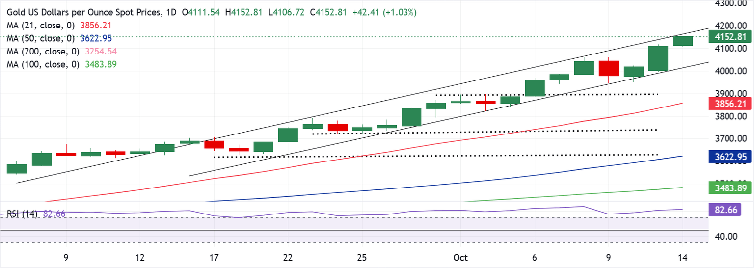 - Gold keeps on printing new record highs beyond the $4,100 threshold; focus shifts to Powell’s speech.