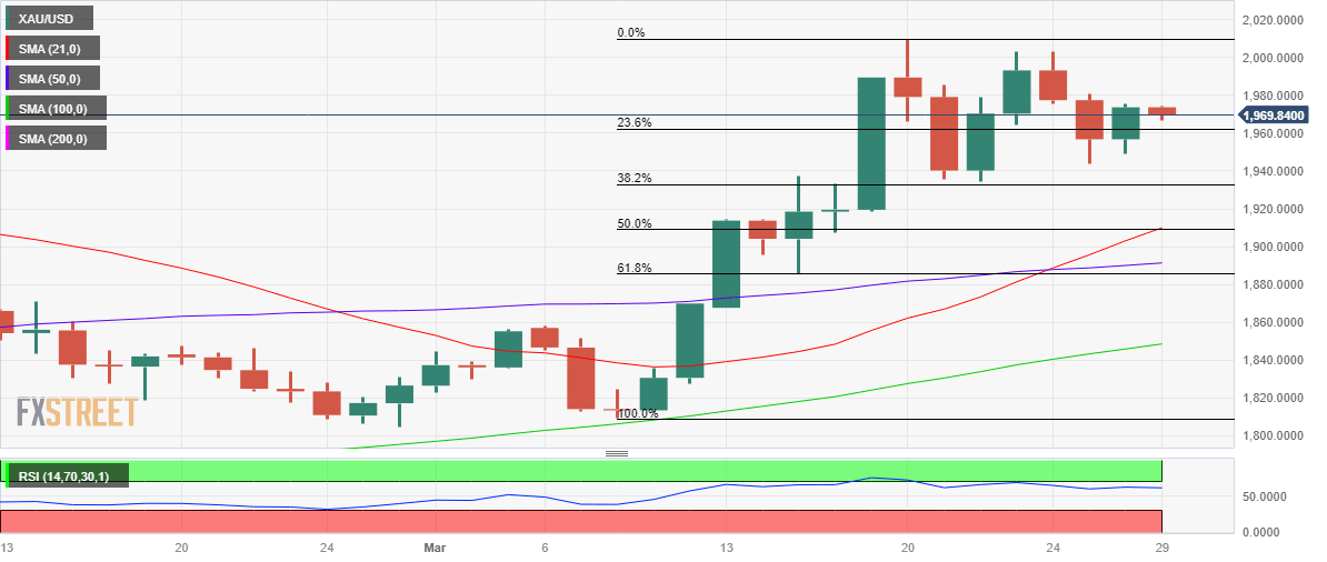 - XAU/USD recaptures 23.6% Fibo level, looks to $2,000 next amid bullish RSI.