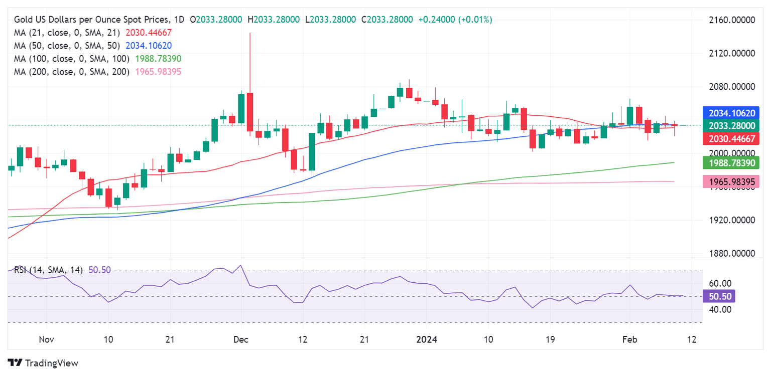 Gold price extends its struggle with the $2,030-$2,035 region. That level is the confluence of the 21-day and 50-day Simple Moving Averages (SMA).