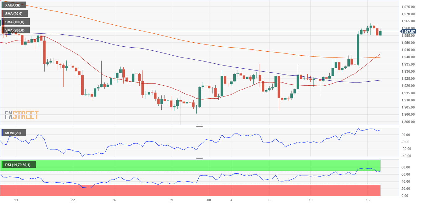 The XAU/USD pair surpassed its former weekly high by a few cents, establishing a fresh one at $1,963.56. Technical readings in the daily chart maintain the risk skewed to the upside, but the positive momentum faded. Technical indicators turned flat within positive levels, while a mildly bullish 100 Simple Moving Average (SMA) provides support at around the intraday low of $1,952.40, while the 20 SMA remains directionless way below the longer one, all of which limits the bullish potential.