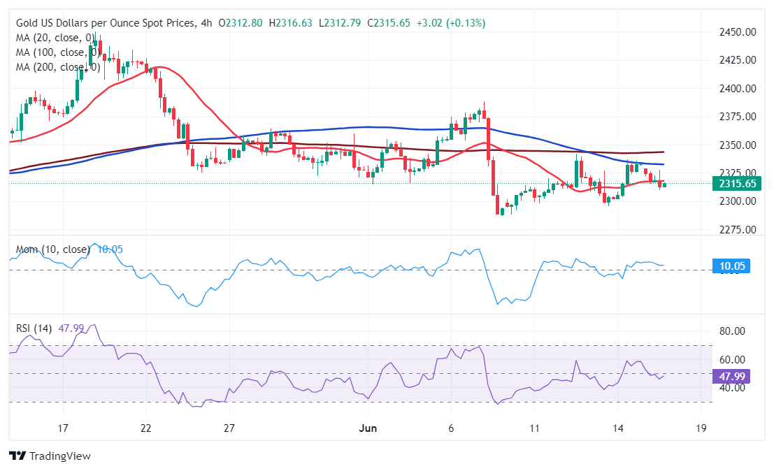 XAU/USD came under selling pressure after Wall Street’s opening and trades near an intraday low of $2,309.84. The US Dollar was generally stronger throughout the Asian and European sessions as caution prevailed. China released mixed data at the beginning of the day, as May Industrial Production rose by 5.6% YoY, missing expectations, while Retail Sales in the same period were up 3.7%, beating estimates. The news fell short of boosting the market mood, which remained sour also during European trading hours amid political turmoil following far-right parties victory in the European Parlamentary election.