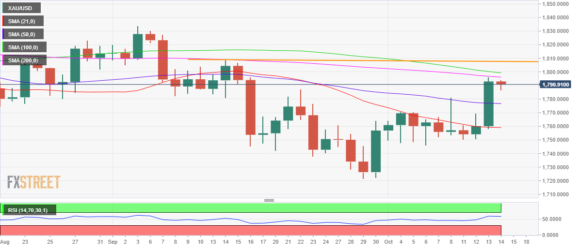 Indeed, the US September inflation reading emerged as that key catalyst, which prompted a range breakout in gold price after the week-long consolidative mode. Gold price caught a fresh bid wave on Wednesday, after the US Consumer Price Index (CPI) rose by 5.4% YoY vs 5.3% expectations, reinforcing growing concerns over rising price pressures. Gold price rallied as much as $40 on the CPI release to reach four-week highs at $1796, as the US dollar witnessed a squeeze amid ‘sell the fact’ trading. Further, investors brought forward the Fed rate hike expectation, as they believed the central bank could raise rates sooner to fight the rising inflationary pressures. This triggered a sharp sell-off in the longer-dated Treasury yields, leading to flattening of the yield curve and adding to the strength in gold price.