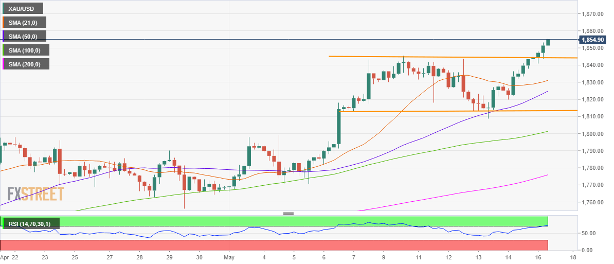 Starting out a fresh week, gold remains on the front foot so far this Monday, having taken out the critical 200-daily moving average (DMA) at $1846. The gold price hovers near three-month highs above $1850, shrugging off the bounce in the US dollar across the board. Gold is benefiting from the risk-averse market conditions, thanks to the renewed worries about coronavirus restrictions in Asia. A major covid outbreak haunts Taiwan and Singapore while India and Japan struggle with rising cases and regional lockdowns. Further, dovish Fed expectations and concerns over dwindling Chinese economic recovery also keep the bullish undertone intact in gold. Gold investors now look forward to the Fedspeak and dollar dynamics amid a quiet start to the week.