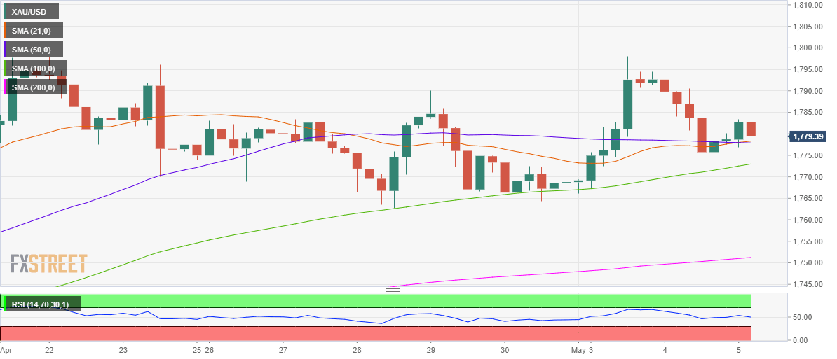 Further south, the ascending 100-SMA at $1773 could help slow down the decline, below which Tuesday’s low of $1770 will be challenged.