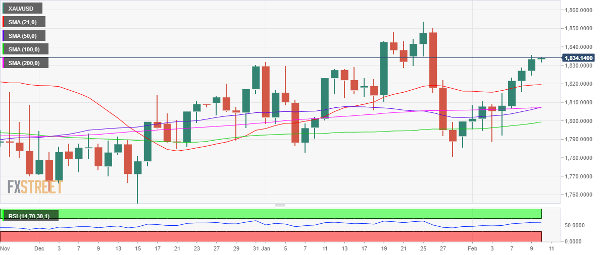 Gold continued to accumulate gains on Wednesday, hitting the highest levels in two weeks at $1,836, although it eased a bit to $1,833 at the close. The bullish undertone in gold price was bolstered by the pullback in the US Treasury yields across the curve from over two-year highs, which undermined the dollar’s demand. Investors resorted to profit-taking ahead of the critical US inflation data due to be reported on Thursday. Additionally, investors remained worried over the impact of soaring inflation on economic growth while the Russia-Ukraine geopolitical risks also helped bolster gold’s safe-haven appeal. The extended rebound on Wall Street further added to the dollar’s misery, boding well for the bright metal.