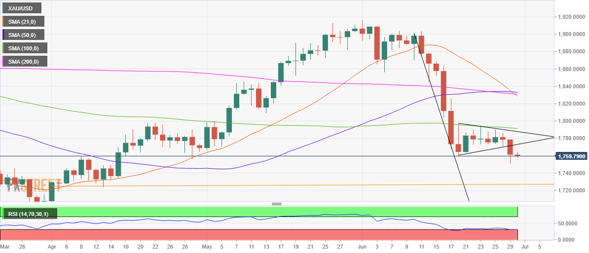 Gold is back in the red zone, wallowing near $1760 after attempting a tepid bounce to the $1765 level. Despite a slight improvement in the market mood, investors still remain cautious, keeping the dollar’s demand underpinned. Meanwhile, stabilizing US Treasury yields also remain a weight on gold price. Heading into the US ADP payrolls data, the greenback is holding the higher ground near weekly highs, undermining gold prices. The ADP report is expected to show 600K jobs addition in June versus 978K recorded previously.