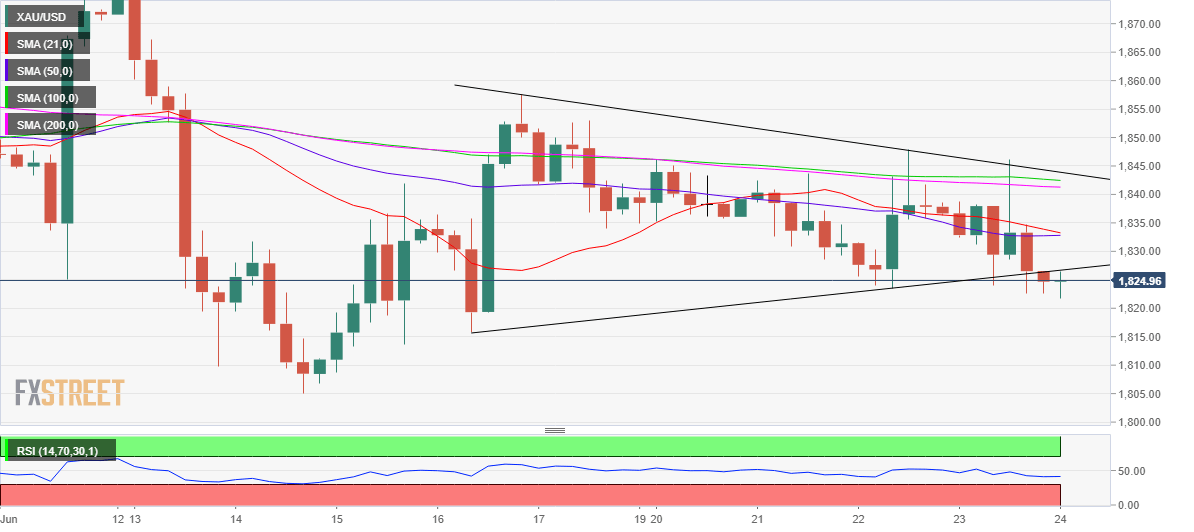 The Relative Strength Index (RSI) is inching lower below the midline on the said time frame, suggesting that there is more room to the downside. Adding credence to the bleak view, the 21-Simple Moving Average (SMA) is on the verge of cutting the 50 SMA lower. A bear cross remains in the offing, calling for a test of the June lows of $1805 on a firm break below the daily low of $1,822. Further down, the key $1,800 round figure will be put at risk.
