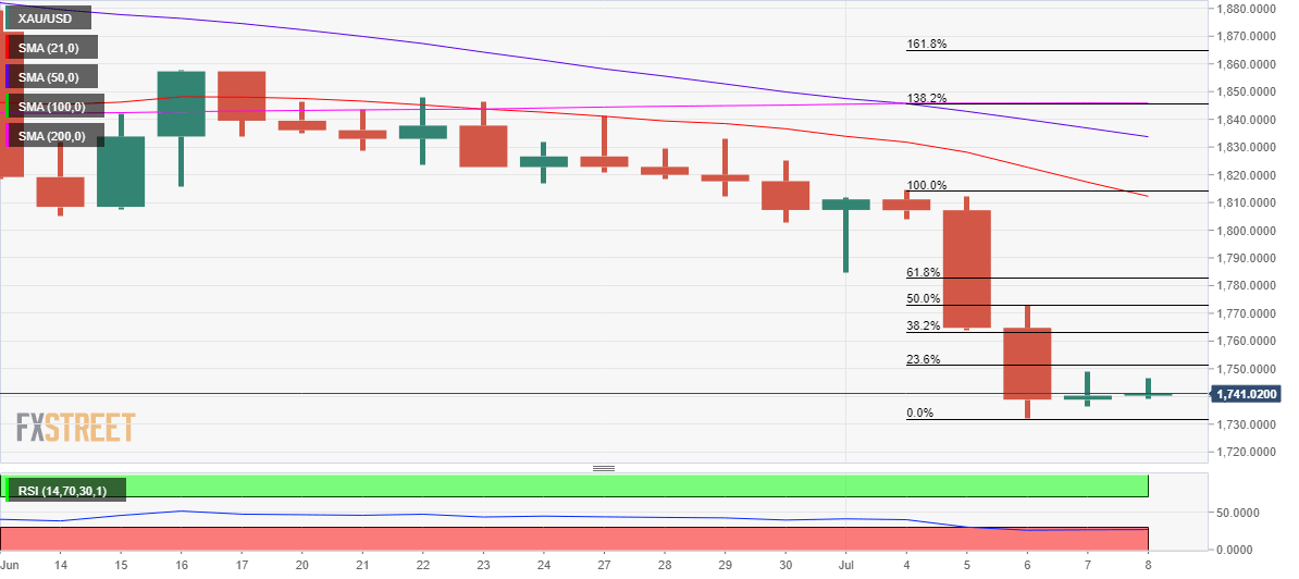 Gold Price is giving back the early recovery gains, as bulls face stiff rejection just below the $1,750 barrier once again. An unexpected negative shift in risk sentiment on news that ex-Japanese Prime Minister Shinzo Abe was shot in the chest at an election campaign speech in Nara. He was immediately taken to hospital but reportedly he was showing no vital signs. The fateful incident rekindled the demand for the US dollar as a safe-haven asset, which capped the renewed uptick in the yellow metal. The risk-off flows returned, reflective of the fresh weakness in the S&P 500 futures and the US Treasury yields. Softer yields are helping gold price stay afloat.