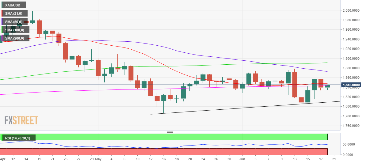 Having found buyers once again near the $1,834 region, Gold Price is attempting a minor recovery above the critical 200-Daily Moving Average (DMA) support now turned resistance at $1,843. In doing so, the bright metal capitalizes on the renewed weakness in the US dollar across the board amid a sudden turnaround in risk sentiment. Thin liquidity conditions, on account of the Juneteenth Holiday in the US, are exaggerating the dollar moves, as the buck resumes its corrective downside from two-decade highs triggered last week. The market mood seems to be improving, as China stocks recover on hopes of more policy measures to support the economy. Although the rapid spread of covid cases in China’s gambling hub, Macau and the Fed’s tightening outlook-led recession fears continue to keep investors on the edge.