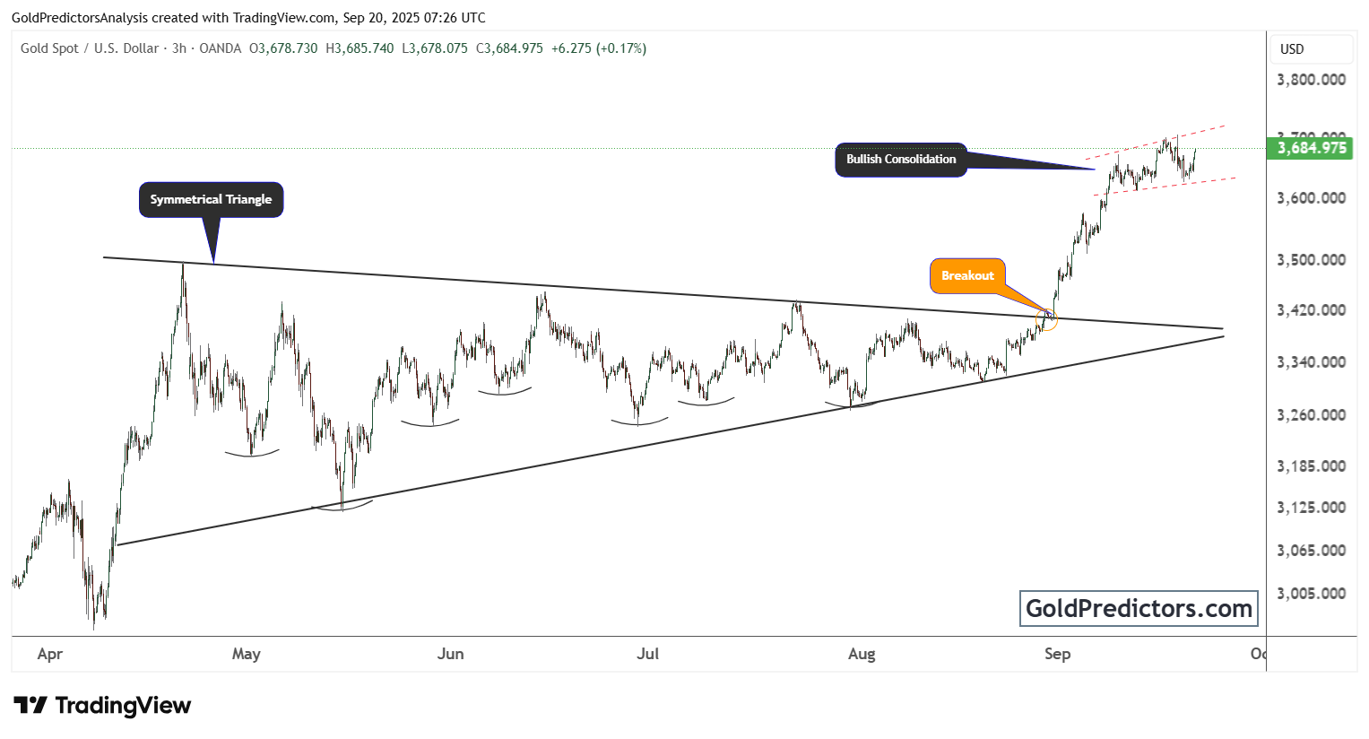 The gold chart below shows a breakout from a symmetrical triangle that formed after months of compressed price action. Throughout this phase, buyers stepped in at higher lows, forming a steadily rising support line. Meanwhile, sellers capped advances at lower highs, establishing dynamic resistance along the upper boundary of the triangle.
