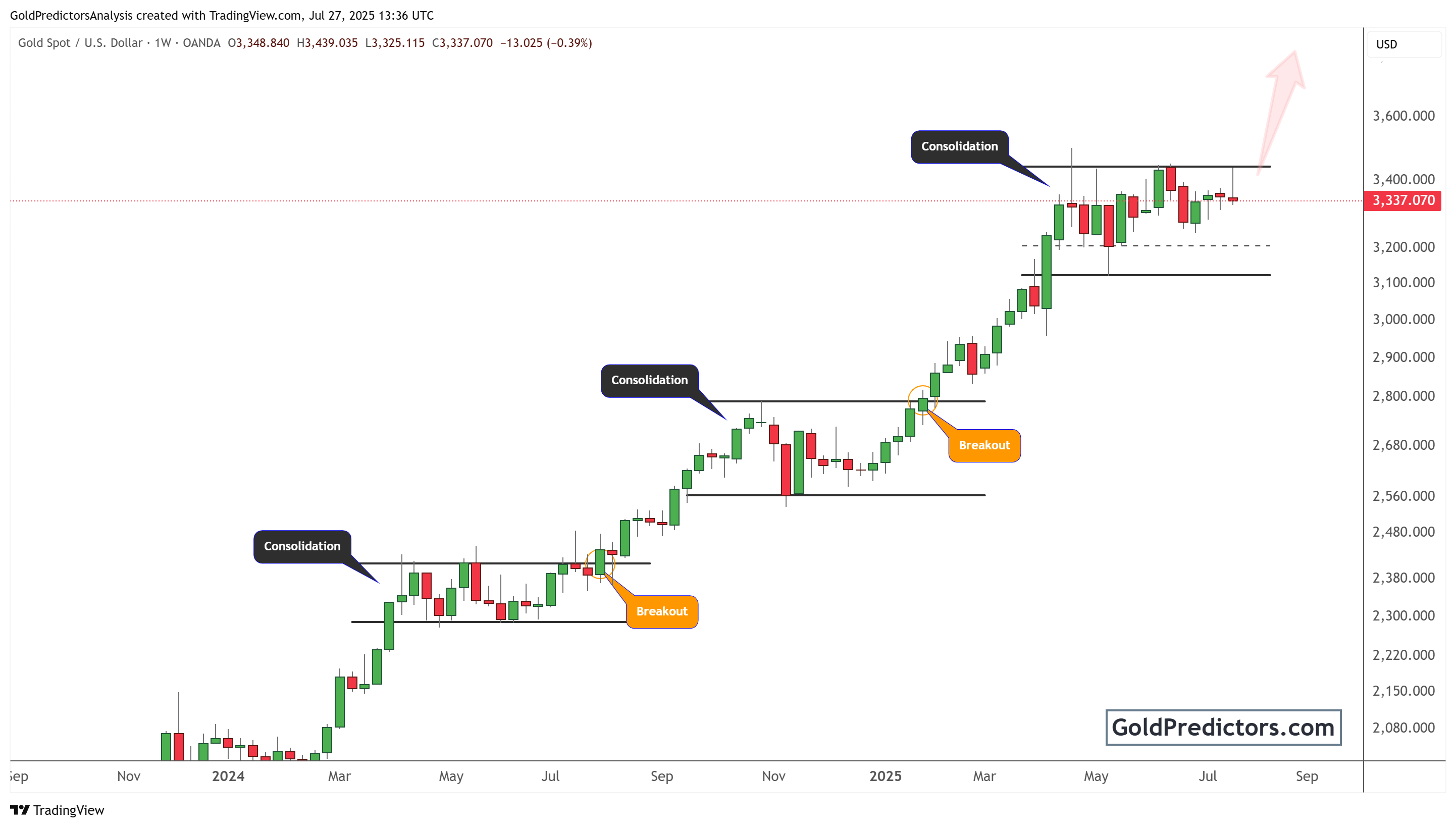 The first key consolidation took place around the $2,400 level. After spending several weeks moving sideways, Gold broke out and surged toward $2,700. Another consolidation phase emerged between $2,700 and $2,900. This range also resulted in a breakout, driving prices beyond the $3,000 mark and confirming the strength of the trend.