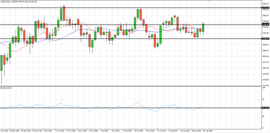 XAUUSD surged to an intraday high of $3,378, which is its highest point in over ten days, moving past a resistance level of $3,365 in the process.