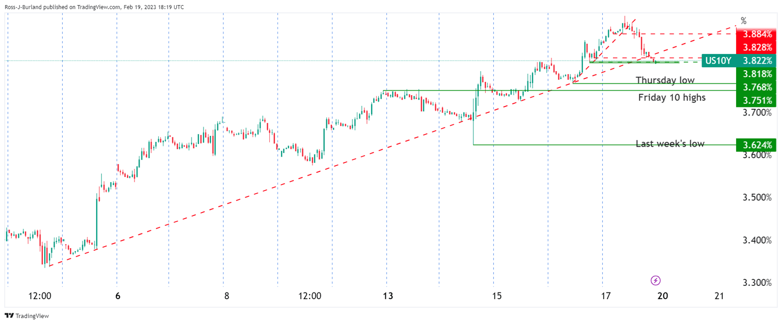 Thursday's lows are vulnerable for the open on an additional push below 3.82% with the market already broken down casting a bullish corrective theme over the Gold price for the start of the week, something forecast last Thursday in anticipation of a short squeeze to end the week to square the books:
