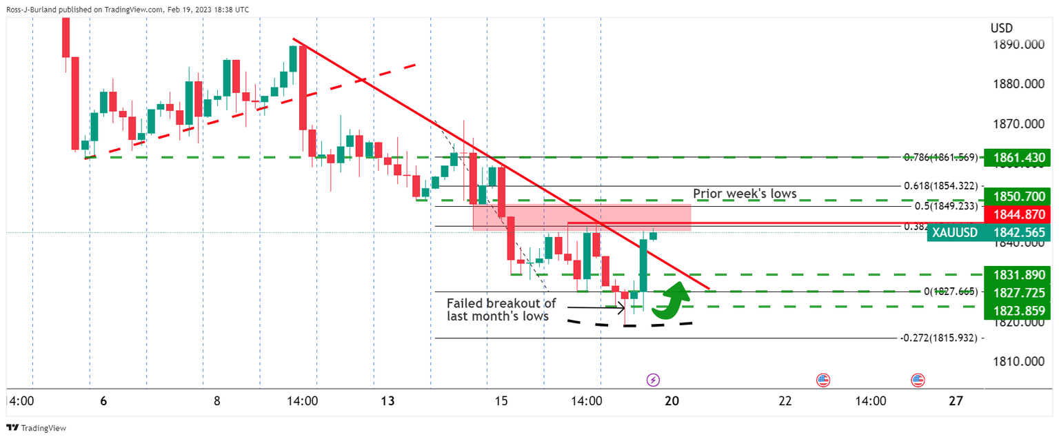 - Gold price bulls eye a break and hold above $1,845 which coincides with a 38.2% Fibonacci retracement.