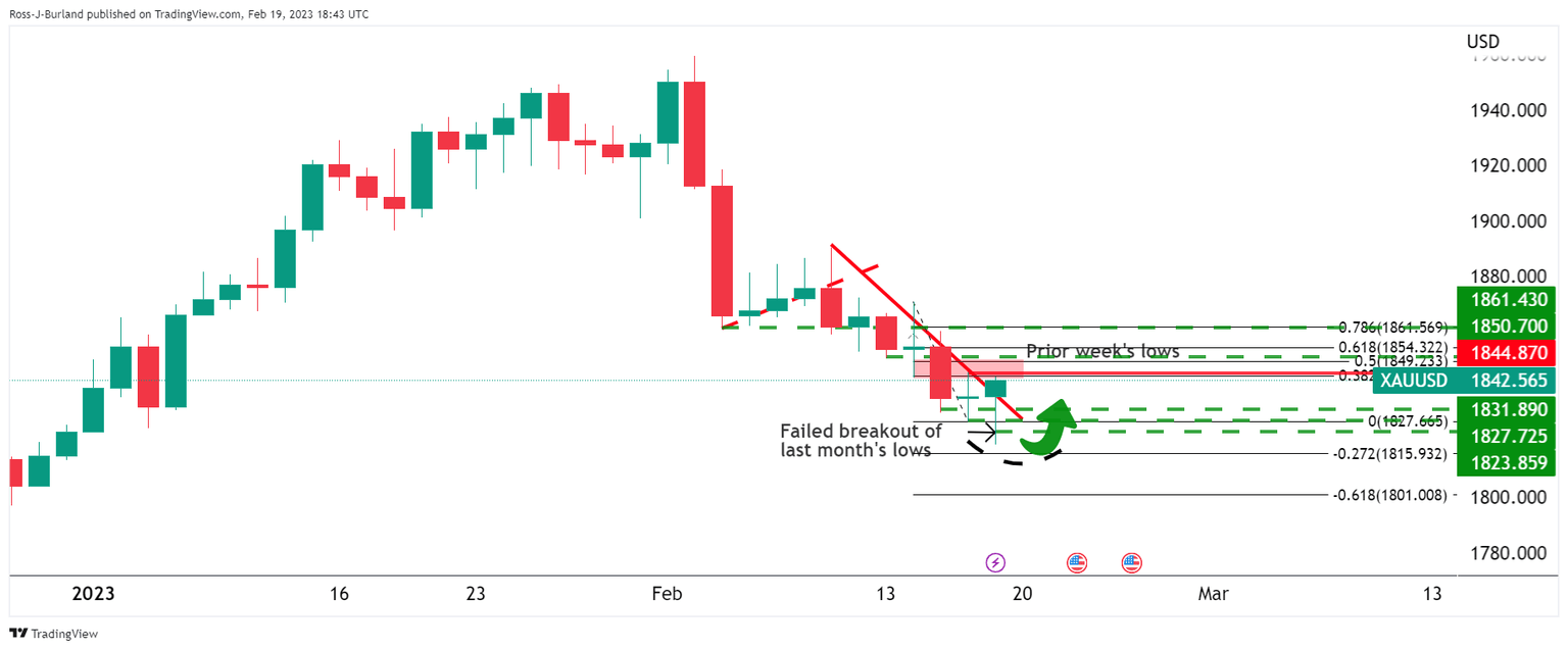 The outlook for the week ahead will be determined by the opening balance. However, with prospects of a solid correction into shorts on a break and hold above $1,845 that coincides with a 38.2% Fibonacci retracement of the prior daily bearish impulse, the prior week's lows near $1,850 are eyed: