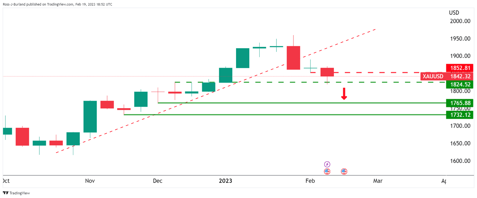 The economic calendar has been a busy one in the United States, resulting in an underlying threat to the Gold price with US inflation rising at a more-than-expected pace 6.4% in January, Retail Sales booming above forecasts, and the Producer Price Index arriving firmly above expectations. The data came in contrast to the market's pricing of a more dovish Federal Reserve and was backed by several hawkish central bank officials speaking out around the events making for a bullish cocktail for the US Dollar and US Treasury yields.