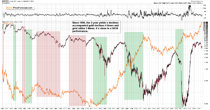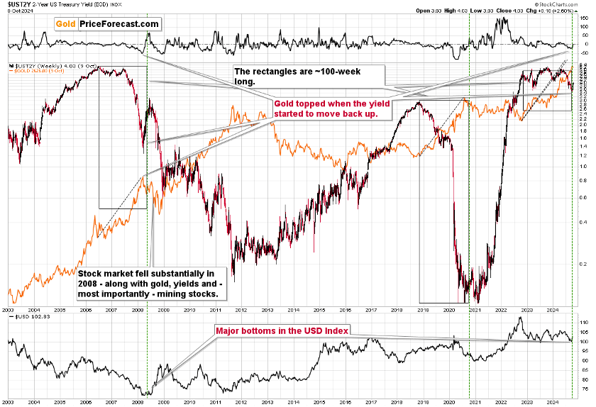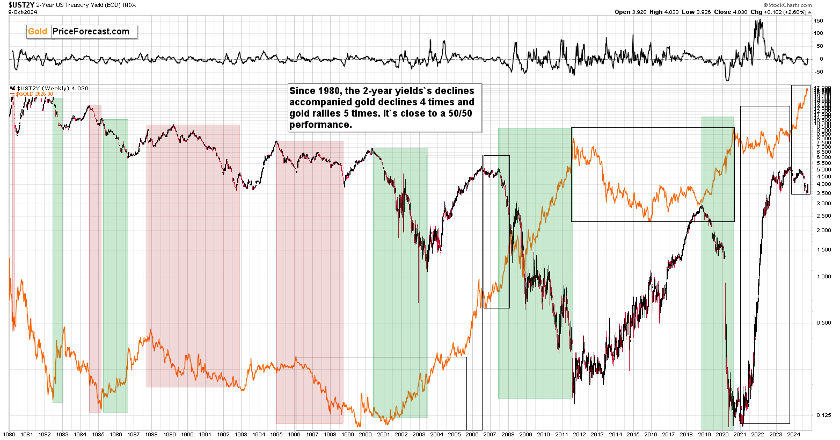 I prepared three charts for you featuring the 2-year bond yield that are likely to shed extra light on the link that to many seems clearer than it should.