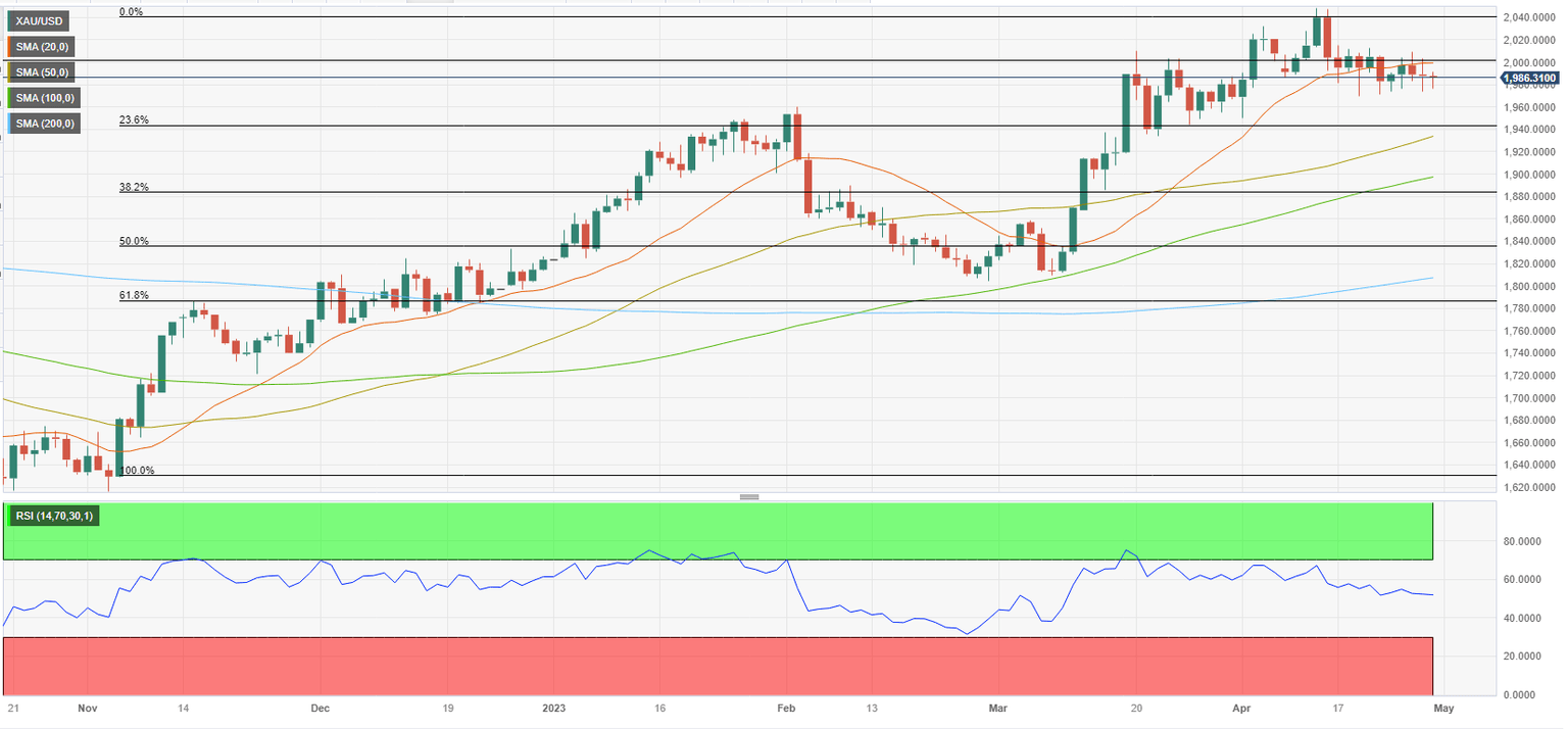 The BEA reported on Friday that inflation in the US, as measured by the Personal Consumption Expenditures (PCE) Price Index, declined to 4.2% on a yearly basis in March from 5.1% in February. The annual Core PCE Price Index, the Federal Reserve's preferred gauge of inflation, edged lower to 4.6% from 4.7% in the same period. n the meantime, the data published by the US Bureau of Labor Statistics showed that the Employment Cost Index, compensation costs for civilian workers, increased by 1.2% in the first quarter, stronger than the 1% increase recorded in the previous quarter. Following these data releases, XAU/USD struggled to stage a meaningful rebound. With the 10-year US yield turning south in the American session, however, the pair pulled away from daily lows but remained below $2,000.