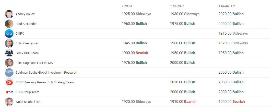 FXStreet Forecast Poll points to a slightly bullish bias in the short term, and the one-week average target aligns at $1,937. The one-month outlook remains overwhelmingly bullish, with several experts who took part in the poll seeing XAU/USD rising to or above $2,000 in that time frame.