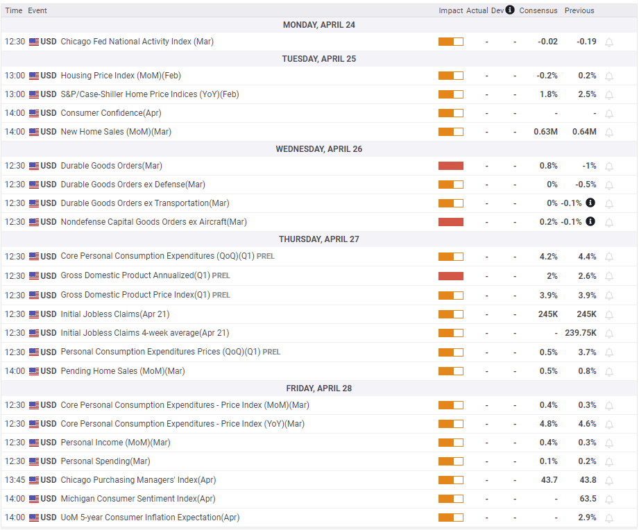 The Conference Board’s (CB) Consumer Confidence Index for April on Tuesday will be the first important data release from the US next week. Last week, the sharp increase in the one-year inflation expectation component of the University of Michigan’s Consumer Sentiment Survey helped the USD gather strength and forced XAU/USD to fall sharply. Hence, a similar reaction to the CB’s consumer survey could be witnessed.