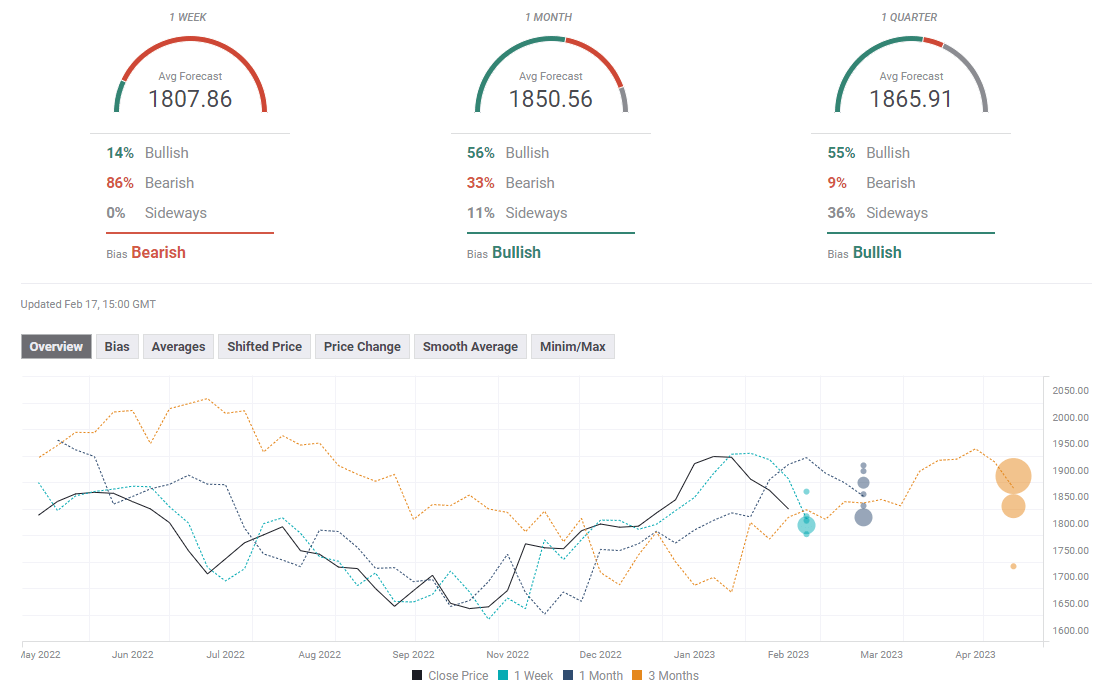 The FXStreet Forecast Poll points to an overwhelmingly bearish bias in the short term, with the one-week target aligning at $1,807. The one-month outlook stays slightly bullish, with several of the polled experts expecting Gold price to rise above $1,900 in that time period.
