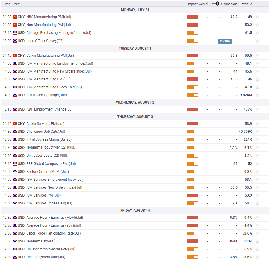 ADP private sector employment report and the ISM Services PMI will be released on Wednesday and Thursday, respectively. On Friday, the US Bureau of Labor Statistics will publish the July jobs report. Nonfarm Payrolls (NFP) are forecast to rise 184,000 in July following the 209,000 increase recorded in June. A reading close to 200,000 should be good enough for the Fed to consider additional tightening in the policy without worrying too much about a significant increase in the Unemployment Rate. If NFP arrives below 150,000, however, dovish Fed bets could weigh on yields and allow Gold price to push higher ahead of the weekend. Please note that the market expectation for NFP is subject to change approaching the release data.