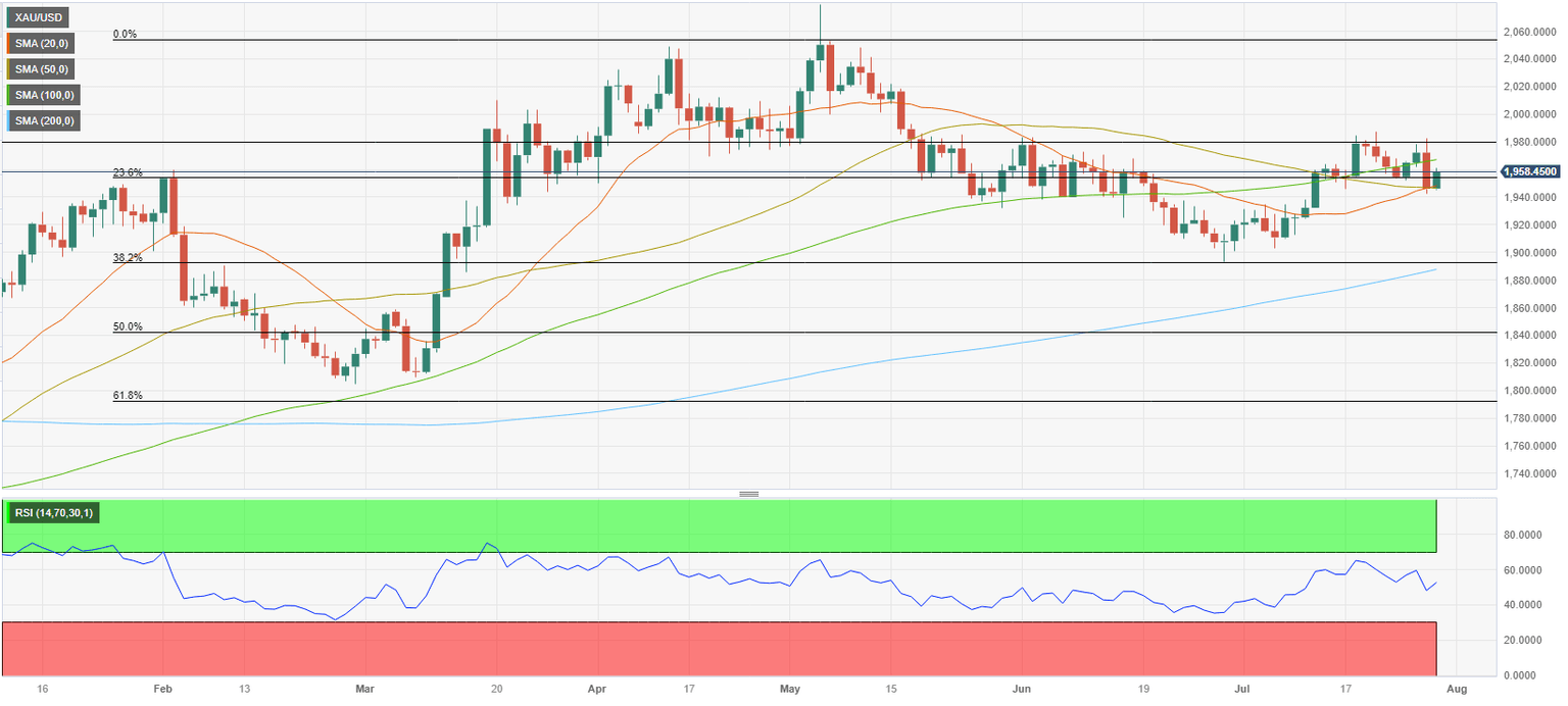 Gold price made a U-turn in the second half of the week and dropped toward $1,950 after rising above $1,980 as upbeat data releases from the US pushed back against market expectations for a no-change in Federal Reserve policy rate for the rest of the year. XAU/USD, however, erased a large portion of its weekly losses on Friday as the US Dollar (USD) lost its appeal. July jobs report from the US could trigger the next big action in XAU/USD next week.