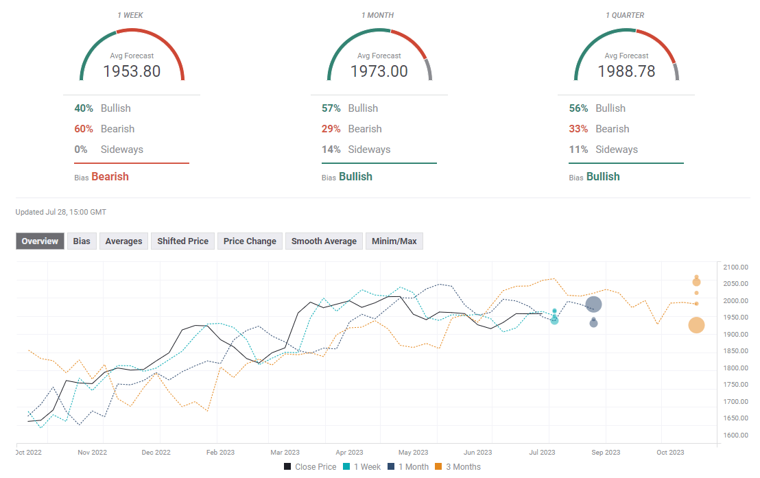 FXStreet Forecast Poll points to a slightly bearish bias in the near term, with the average target aligning at $1,953. The one-month outlook remains bullish, with some of the polled experts seeing Gold price reaching $2,000 in that time frame.