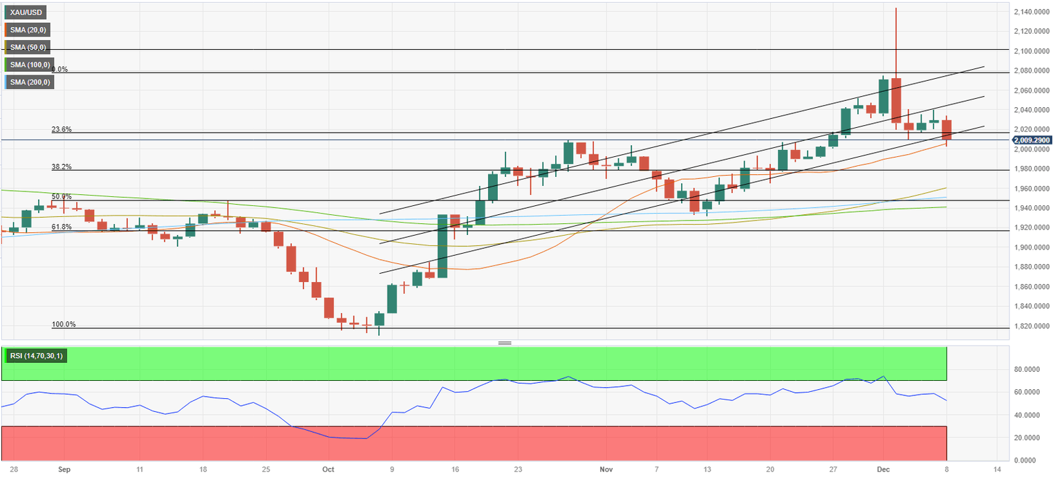 Gold opened with a huge bullish gap and reached a new all-time-high near $2,150 in the early Asian session on Monday as markets reacted to escalating geopolitical tensions. After Yemen's Houthi rebels hit three commercial ships in the Red Sea on Sunday, a US warship responded by shooting down three drones. Yemen's Houthi movement acknowledged that they had targeted two Israeli ships, stating that they were responding to calls from Islamic nations to stand with the Palestinian people. This development revived fears over the Israel-Hamas conflict turning into a widespread crisis in the Middle East. Following the record-setting upsurge, profit-taking triggered a deep correction in XAU/USD and the pair closed in negative territory near $2,030.