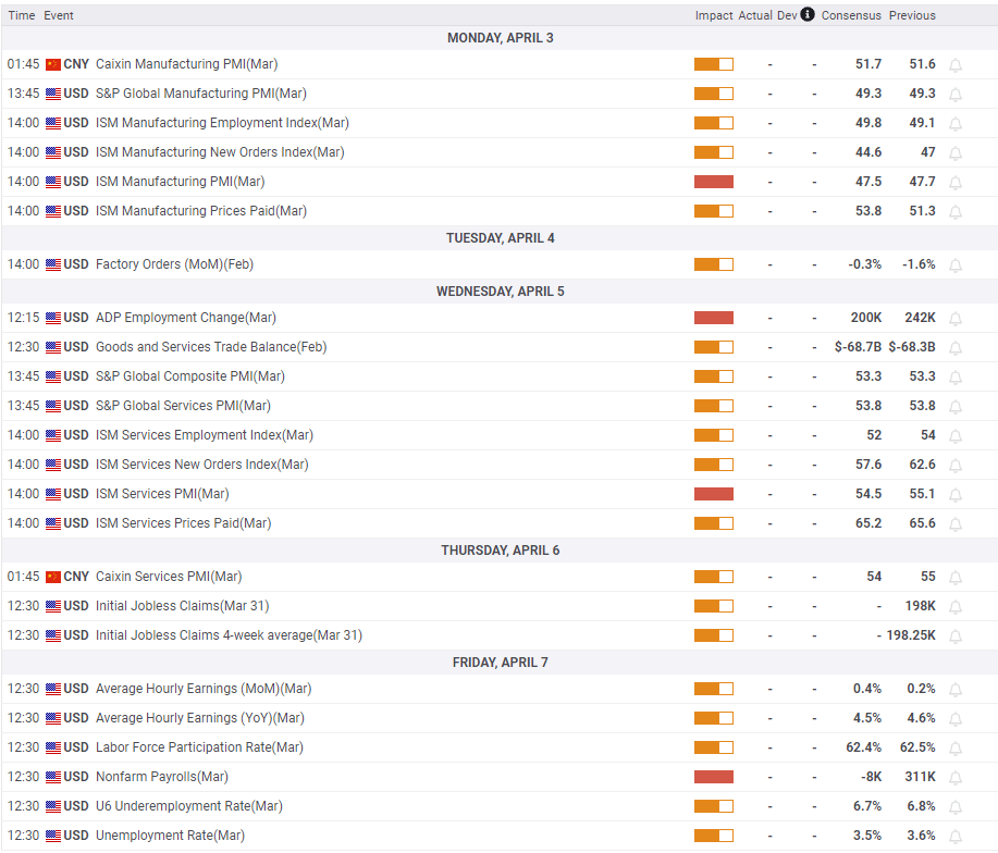 On Monday, the ISM Manufacturing PMI from the US will be watched closely by market participants. In February, the Prices Paid component of the survey climbed to 51.3 from 44.5 in January, revealing an increase in input inflation. Markets are yet to figure out whether the US Federal Reserve will raise its policy rate one more time by 25 basis points (bps) in May. If the PMI survey points to an acceleration in the manufacturing sector's input inflation, hawkish Fed bets could return and help the USD find demand. Evidently, XAU/USD is likely to come under bearish pressure.