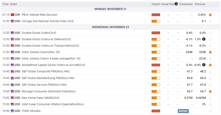 All the important US data will be released on Wednesday next week and it will not be easy for investors to navigate through them. S&P Global will publish the preliminary Manufacturing and Services PMI surveys for November. In October, the Services PMI declined to 47.8 from 49.3 in September and showed that the business activity in the service sector continued to contract at an accelerating pace. In case the Services PMI falls further in early November, the US Dollar could struggle to find demand and allow XAUUSD to stretch higher. Later in the day, the US Federal Reserve (Fed) will publish the minutes of the October policy meeting.