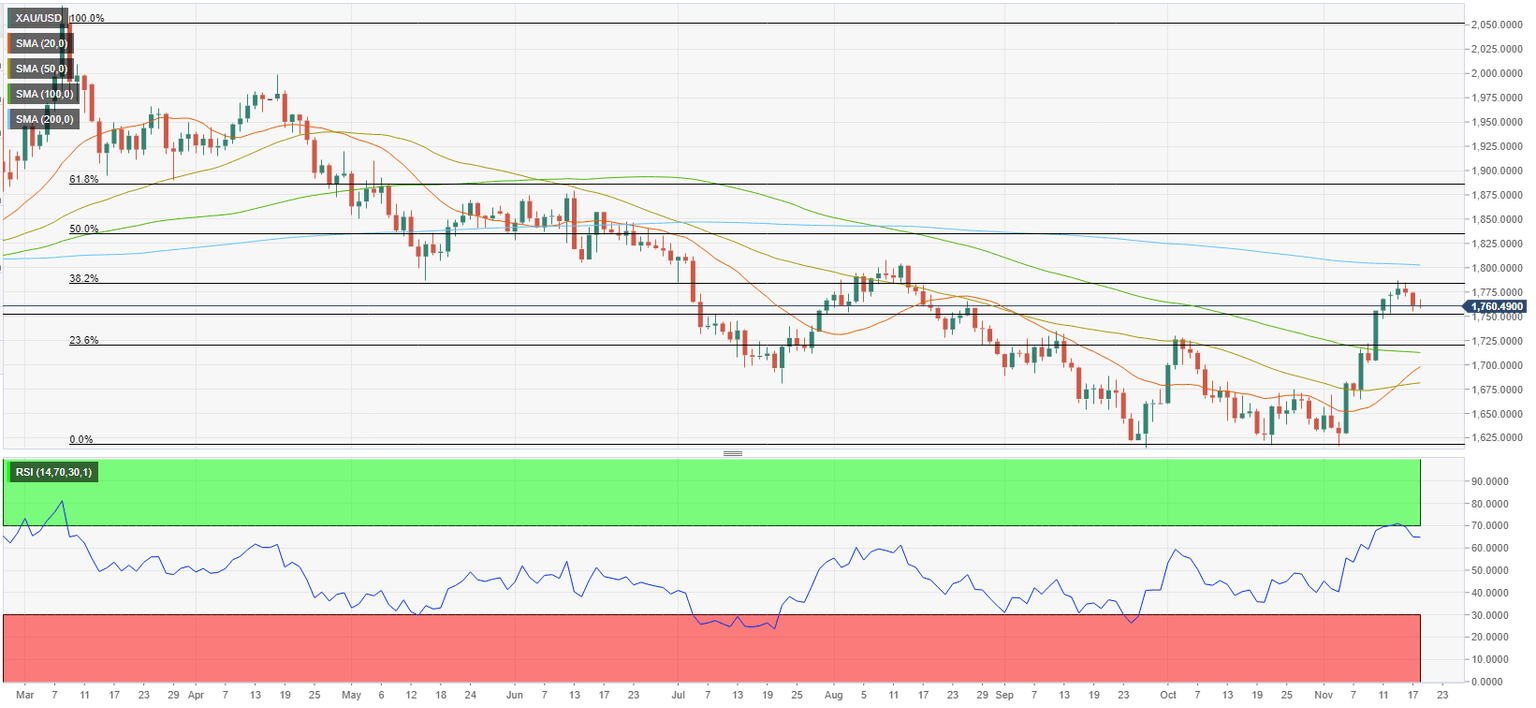 On Thursday, the US Census Bureau reported that Housing Starts and Building Permits declined by 4.2% and 2.4%, respectively in October. These figures reminded investors of the negative impact of rising rates on the housing market and made it difficult for the USD to extend its rebound. Nevertheless, Gold price closed the day in negative territory, pressured by the 2% increase seen in the benchmark 10-year Treasury bond yield.