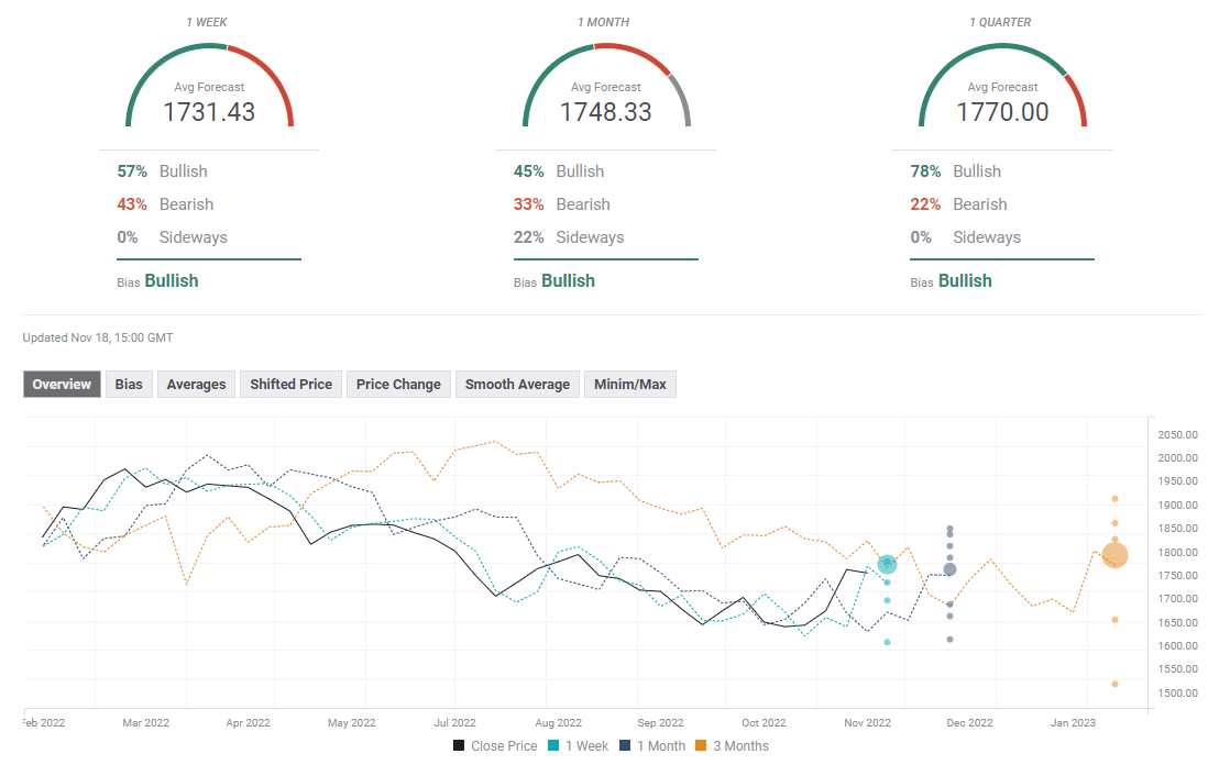 FXStreet Forecast poll paints a mixed picture for XAUUSD in the short term and the one-week average target sitting at $1,731. The one-quarter outlook remains overwhelmingly bullish with an average target of $1,770.