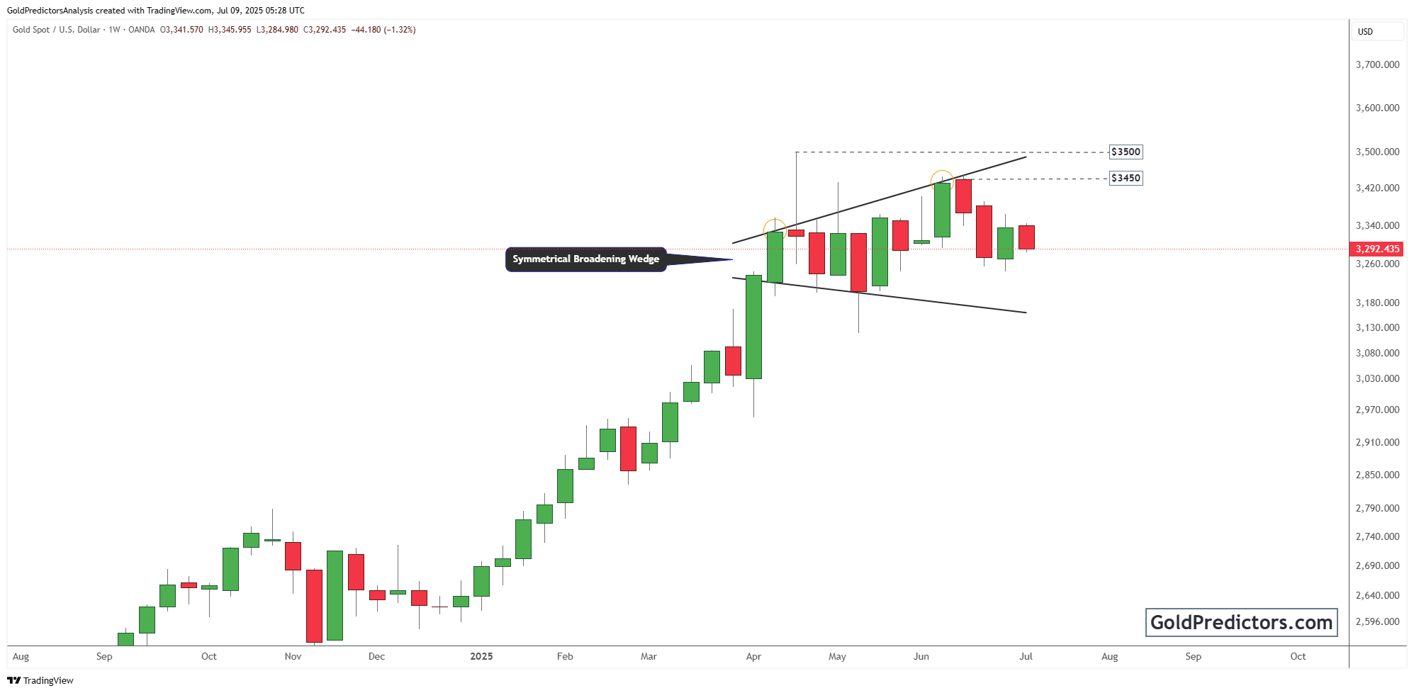 The gold chart below shows that after a strong rally from late 2024 through early 2025, gold’s bullish momentum has started to weaken in recent weeks. The price has begun to consolidate. This consolidation resulted in the formation of a Symmetrical Broadening Wedge pattern on the weekly chart. The pattern reflects a period of indecision following a strong uptrend.
