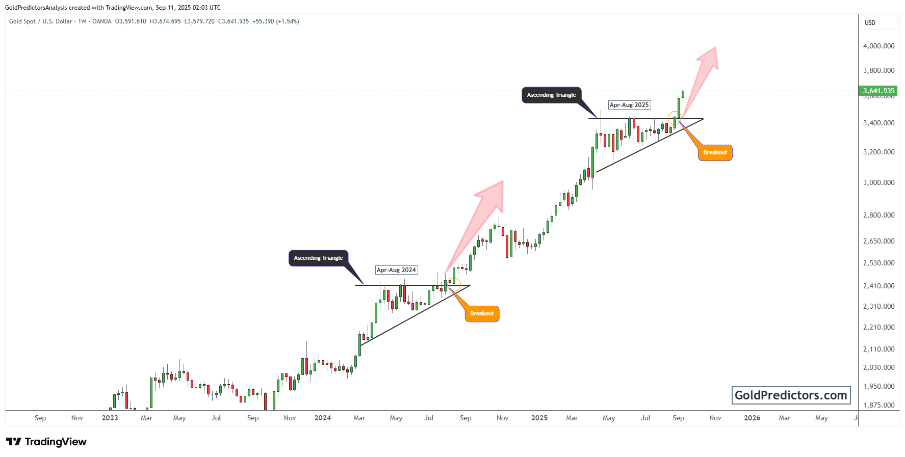 The gold chart below shows multiple triangle patterns that have formed on the weekly timeframe. Each pattern was followed by a strong breakout, with one developing in 2024 and the other in 2025. Typically, ascending triangles indicate bullish consolidation, with price forming higher lows beneath a steady resistance level. This formation signals increasing bullish momentum, with buyers steadily gaining control over the market.